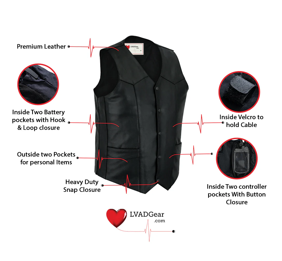 FASHION & FUNCTION: The Leather LVAD vest is crafted from lightweight leather, designed for year-round wear. It combines a fashionable look with the ability to completely conceal the LVAD. The vest features battery pockets on the inside, positioned under the arms for comfort and balance. These pockets secure the batteries in place with hook-and-loop closures. There are four internal pockets to hide your HeartMate Controller. The vest is intentionally long enough to fully conceal your driveline while being carefully patterned for both style and practicality.